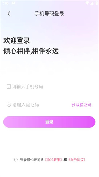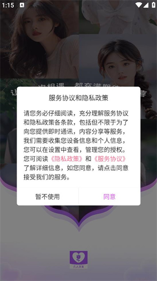 1、下载并安装附近速配闪聊app,点击同意服务协议和隐私政策。