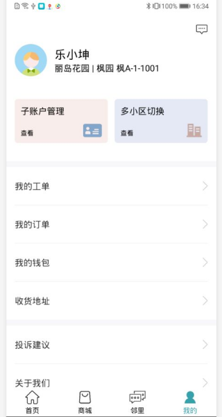 1、下载安装app,进入首页,这里可以看到智能开门、报事报修、在线缴费版块;