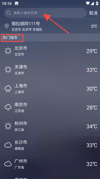 3、浏览选择热门城市或搜索框输入关键字查找想要添加的城市即可。