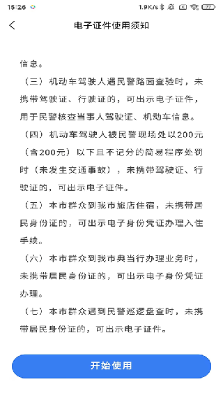 2. 查看电子证件使用须知,随后点击下方的【开始使用】。