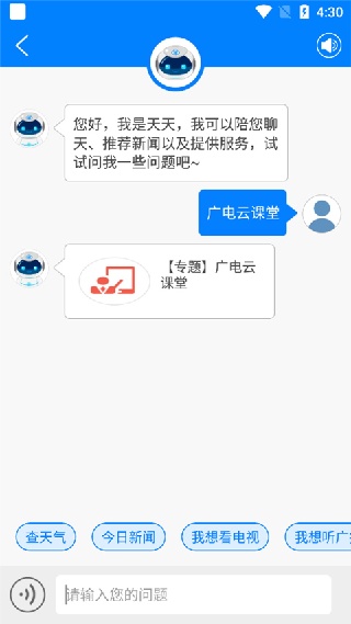 5. 输入广电云课堂,点击小机器人回复的专题进入。