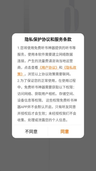 1、下载安装软件后进入,弹出隐私保护协议和服务条款,点击同意。
