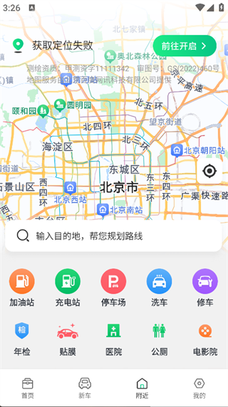 4. 点击页面下方的‘附近’,即可看到附近的加油站、充电站、停车场等。
