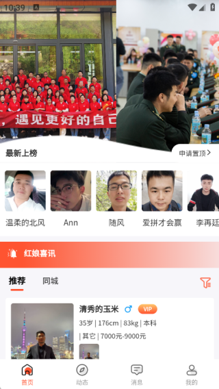 1、在首页中有最新上榜的优秀人群,还为用户推荐适合的朋友,同时了解同城的信息;