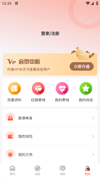 4、在我的页面中可以开通vip会员,还可以进行完善资料、红娘牵线以及我的动态等内容。