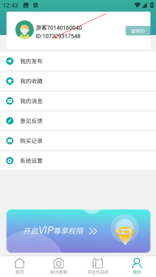 3、我的页面显示游客身份及ID,设有我的发布、收藏等功能,还有开启VIP权限推广,便于用户管理个人信息与享受更多服务。
