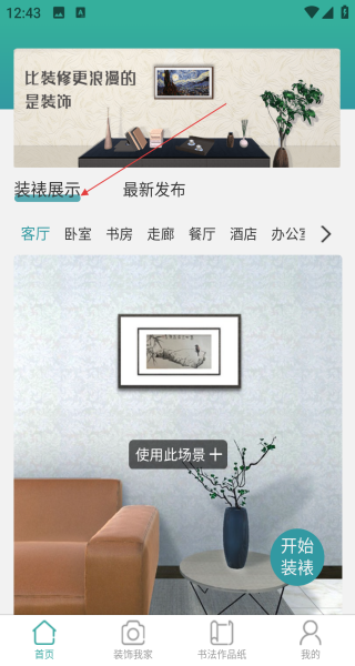 2、首页有装裱展示等板块,涵盖客厅等多种场景分类,还有开始装裱功能入口,方便用户进行字画装饰操作。