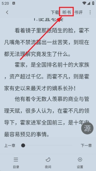 4、进入到小说的阅读界面,点击上方的听书,就可以开启听书模式了。