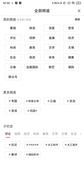 1、点击首页右上角三条横杆图标,进入全部频道页,能够选择或添加心仪的频道。