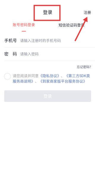 2、用户进入登录界面后,在对应输入框中准确录入您的手机号码、密码,点击登录按钮即可开启APP的使用之旅,若还没有账号点击注册选项即可进入注册页面。