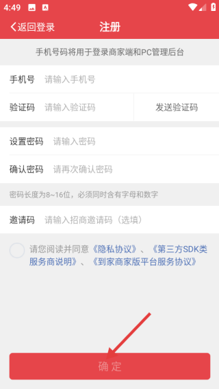 3、在注册页面依次在输入框中填写手机号码、获取并输入验证码,然后设置密码并再次确认密码,填写完成后点击确定按钮,即可完成到家商家版软件的注册流程。
