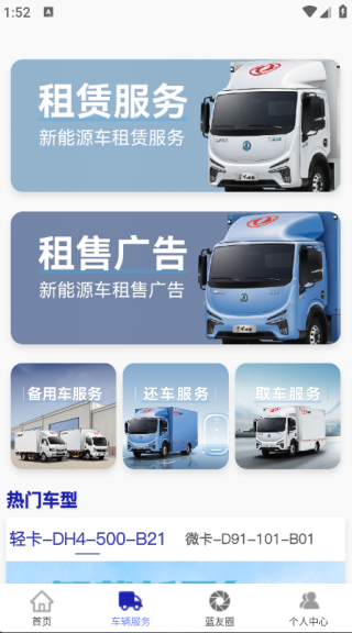 3. 点击页面下方的‘车辆服务’,即可看到租赁服务、租售广告、换车服务等功能;