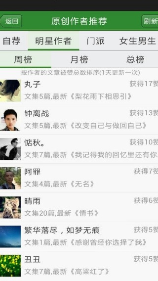 4、明星作者周榜内容及时更新,第一时间去阅读。
