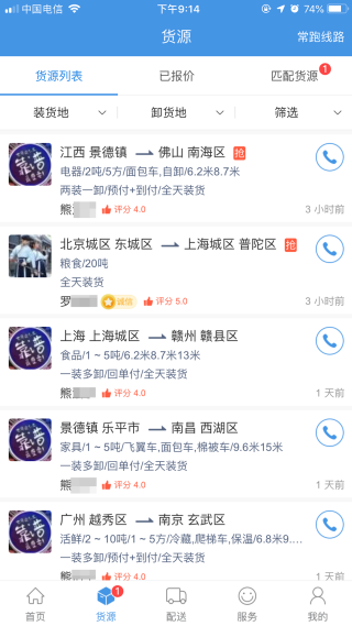 1、货源筛选,直接可以根据装货地、卸货地等信息进行快速查找;