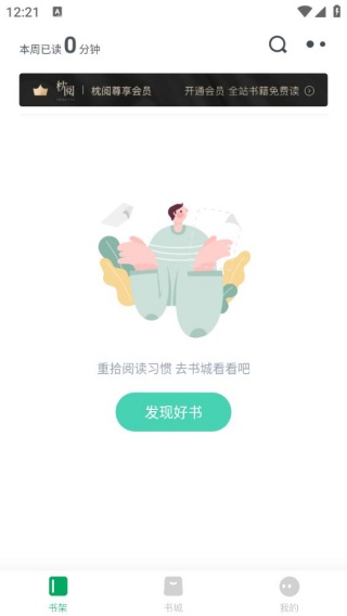 2、进入到书架界面,有本周已阅读时间提供,还可以去查看收藏书籍。