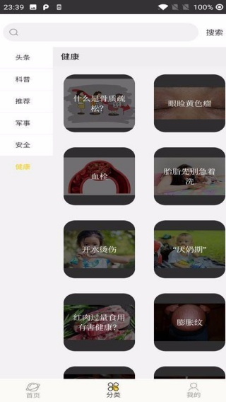 3、点击健康类型,有关健康的资讯一目了然,大家阅读方便高效。