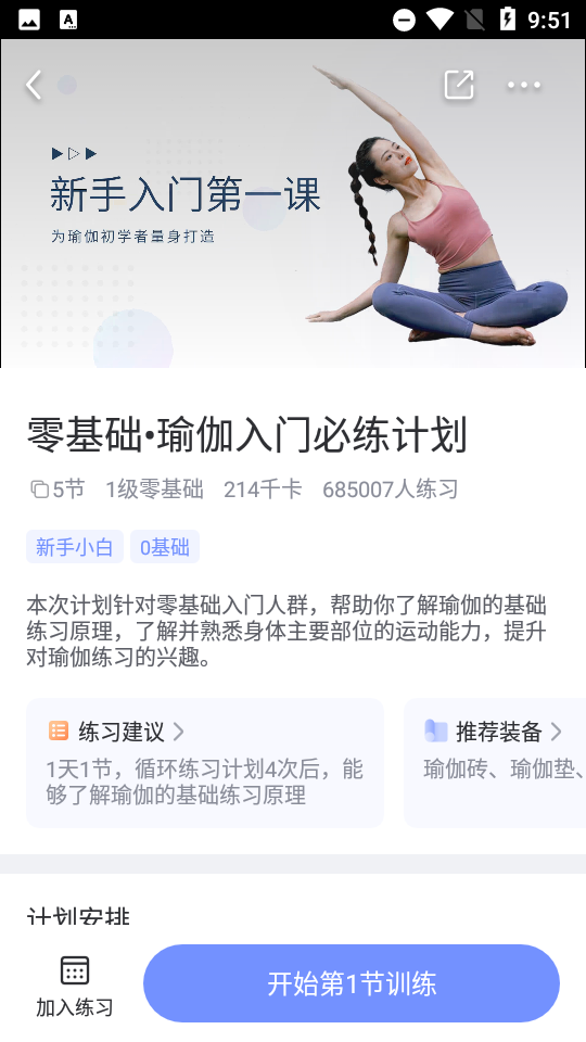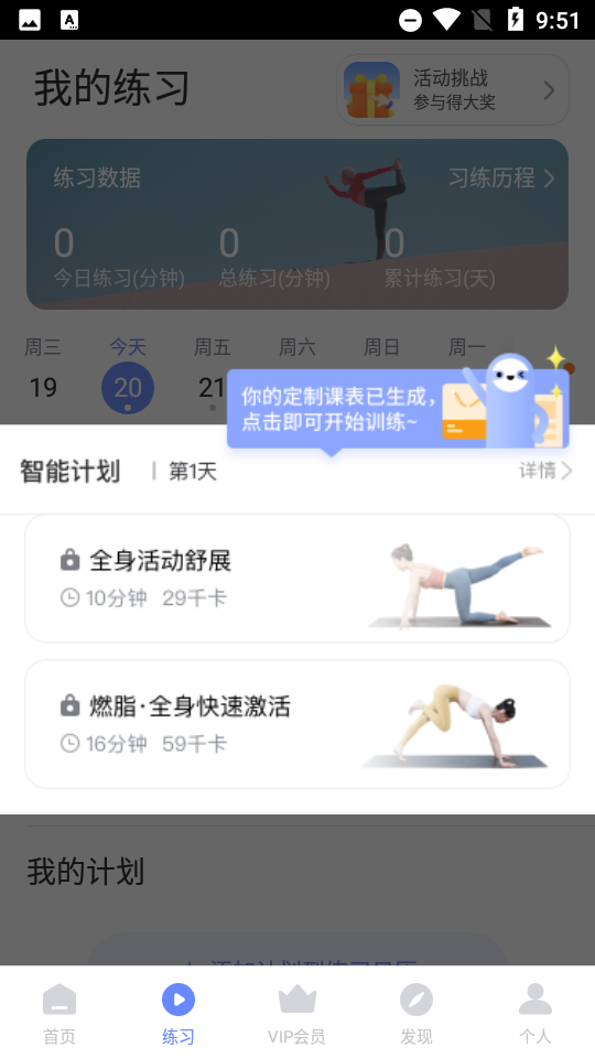 1、打开APP首页,点击智能计划入口,根据自身基础生成专属瑜伽方案,包含每日适配课程。