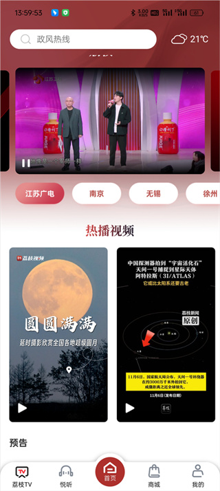 2、荔枝TV:可观看江苏卫视、新闻频道等多个电视频道的实时直播及精选节目回放。