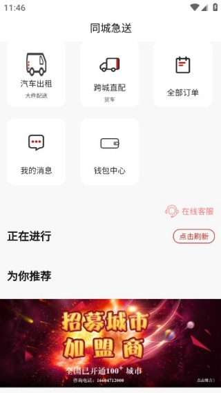 3、服务模块包含同城配送、车辆租赁、跨城运输等选项