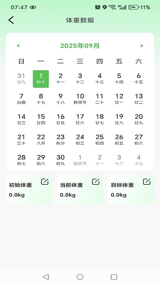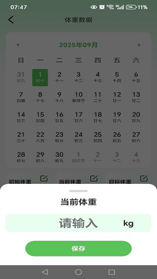 2、在记录模块选择日期,可添加当日体重及身体指标数据