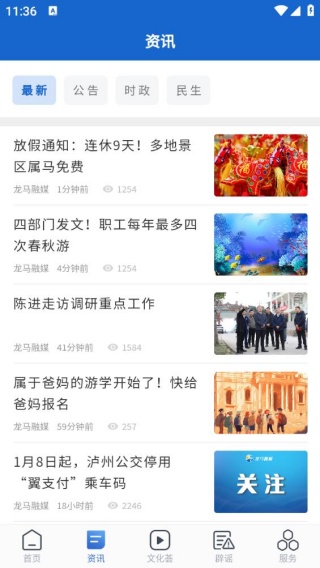 1、在平台首页资讯板块,可浏览最新资讯、公告通知、时政要闻、民生动态等分类内容。