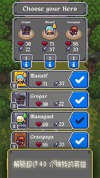 1、也会滑动屏幕还能让角色在场景中四处移动,你要灵活的制定自己的战略,还要获得战利品并施放新的法术,你要成为让人闻风丧胆的勇士并为自己的王国效力,作品的像素主题风格完美的展现了老式街机的画面,这也让作品变得古怪另类且极具幽默感,这部作品中的角色拥有自己的独特特长。