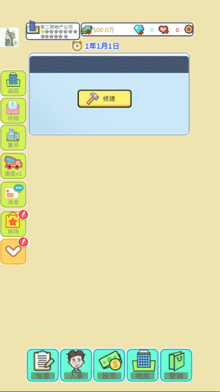 2.调整好之后,开始动工,然后在营销里面,点击秘书及鼓励师,确保2次以上的建造速度×4。在房子快建造的时候,招2个专家级销售(利用钻石解锁销售空位),再从营销里面观看3次以上的金牌销售,这样可以确保资金快速回笼(注意:当钻石足够时 多解锁建造师及销售员空位,可提高建造速度及销售速度)这样基本上就开始赚钱了!