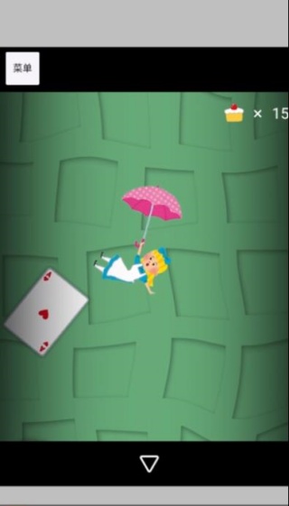 3、利用左右倾斜屏幕的操作方式,控制爱丽丝在绿色场景中移动,避开扑克牌障碍物,专注于收集蛋糕。