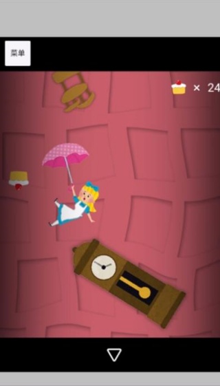 2、通过倾斜屏幕控制爱丽丝移动方向,优先收集蛋糕(右上角显示当前收集数量),避开椅子、时钟等障碍物。