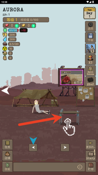 1、您将扮演一位在末日荒原中苏醒的失忆者,通过简单的点击操作在像素风格的世界中探索,搜寻散落的食物、零件等宝贵物资,并与遇到的