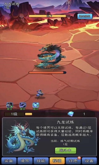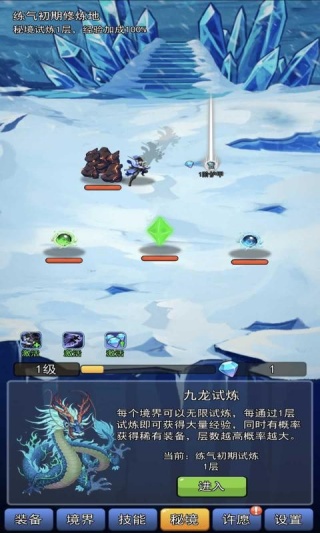 1、进入九龙试炼前,先确认当前境界(如练气初期),优先选择层数较低的试炼层开启挑战,利用100%的经验加成快速积累等级。