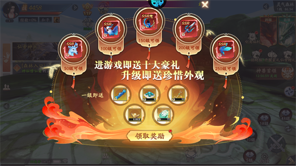 进入游戏即赠送十大豪礼,升级至对应等级可领取ssr坐骑、珍稀外观及大量材料,1级时还能直接领取蓝色武器、铜钱等福利。