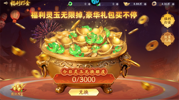 灵玉无限掉落,可用于兑换额度,设有“前往淘金”入口,主打“豪华礼包买不停”。