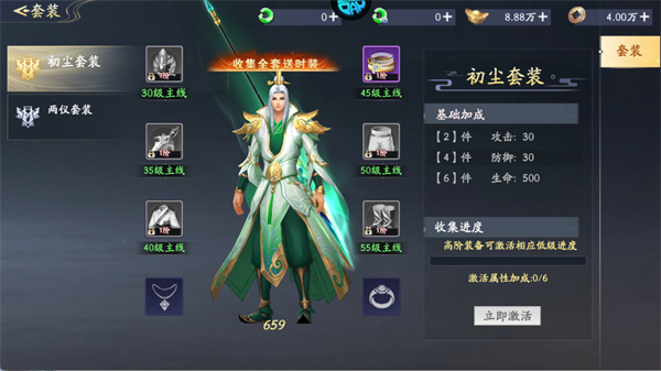 初尘套装和两仪套装,集齐全套可解锁时装,初尘套装提供攻击、防御、生命属性加成。