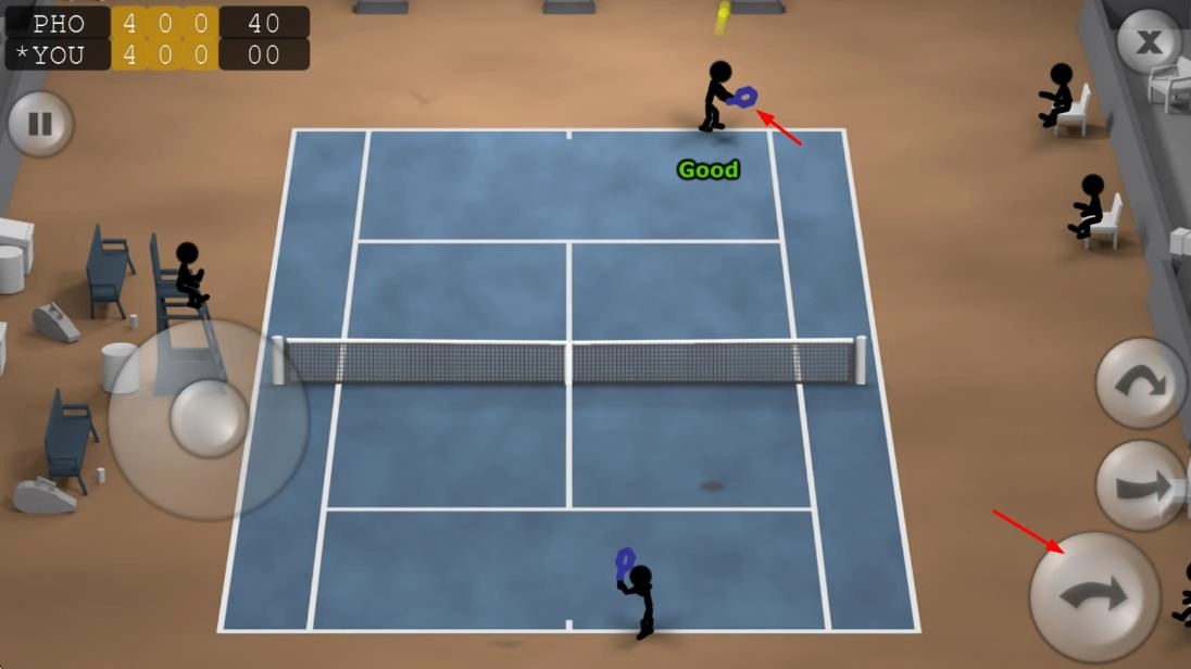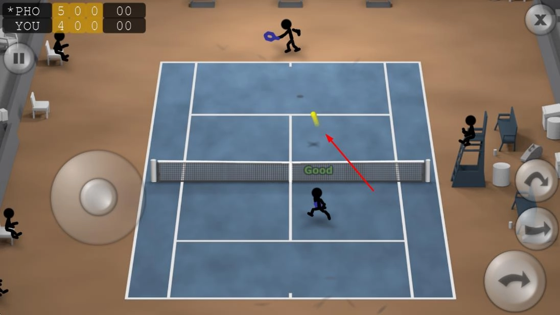 灵活调整站位:借助虚拟摇杆操控火柴人在赛场移动,根据对手击球方向提前调整位置,在最佳点位接应来球,为击球做准备。